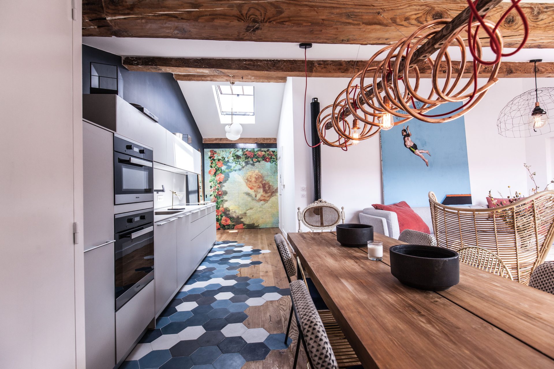 - Évitez les grandes surfaces partout : le carreau de ciment est un accent, un point d’orgue, pas un uniforme. Il doit être mis en scène