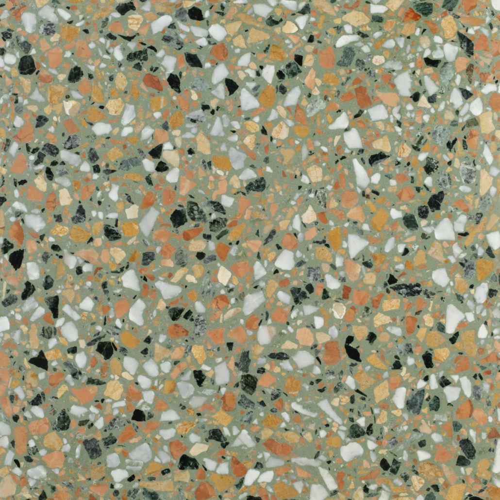 Terrazzo 213 Verde de’ lumi se présente sur une base verte. Vous pourrez y voir des petits et grands éclats de couleurs terracotta, gris et vert foncé.